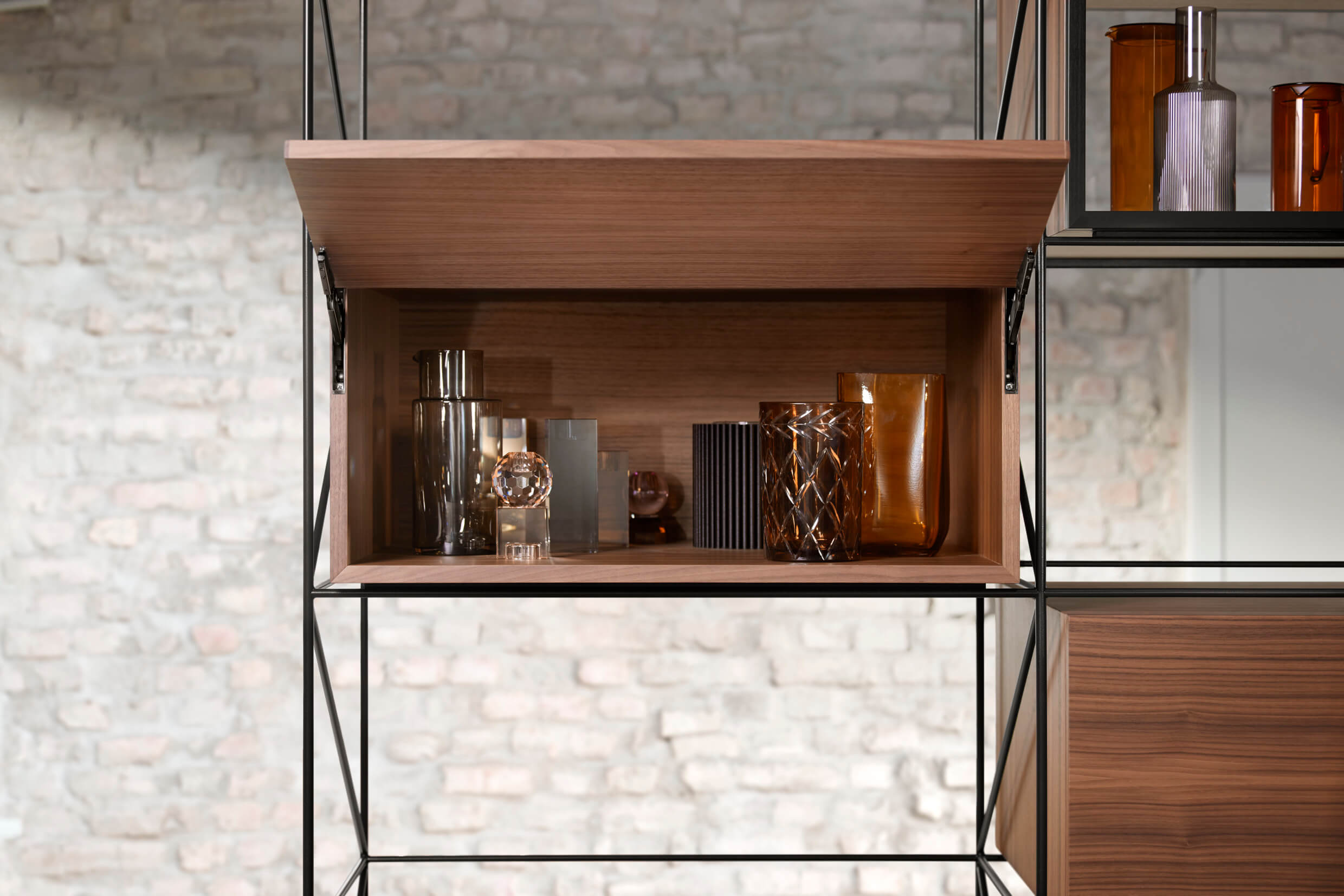 A diferencia de otros sistemas de elevación que agregan volumen o alteran la línea visual del mueble, HKi mantiene un diseño integral. Incluso en frentes de vidrio, el sistema permanece oculto al cerrar.