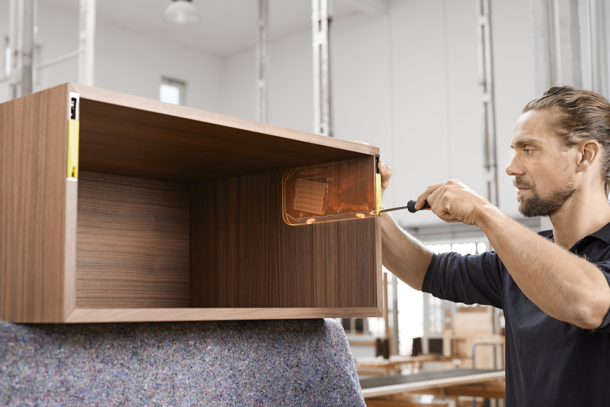 Más allá del diseño minimalista, Aventos HKi está pensado para facilitar la vida en planta. Aquí no se trata solo de estética: se trata de productividad, precisión y eficiencia en el proceso de fabricación.