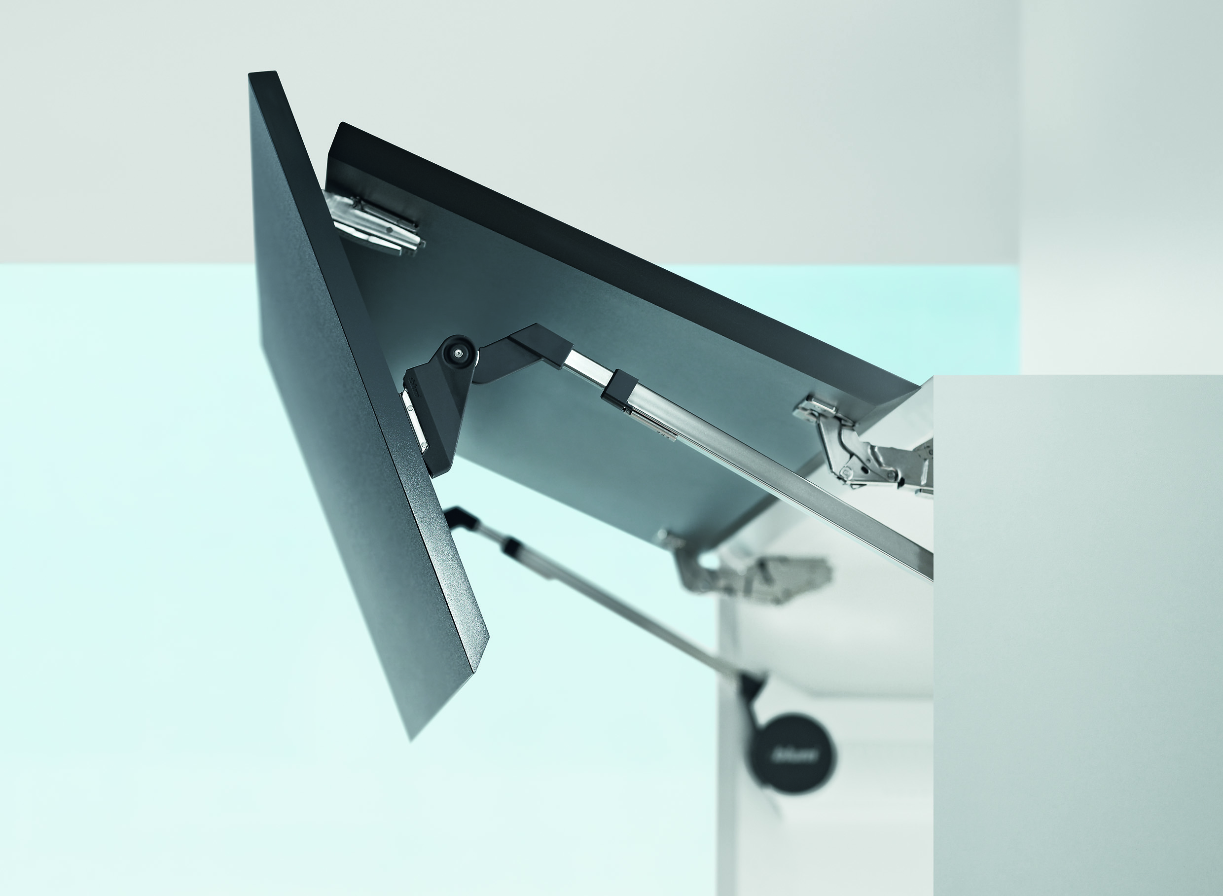 Es un mecanismo de apertura para puertas de muebles altos, mediante un desplazamiento corto, frontal y vertical paralelo al mueble.