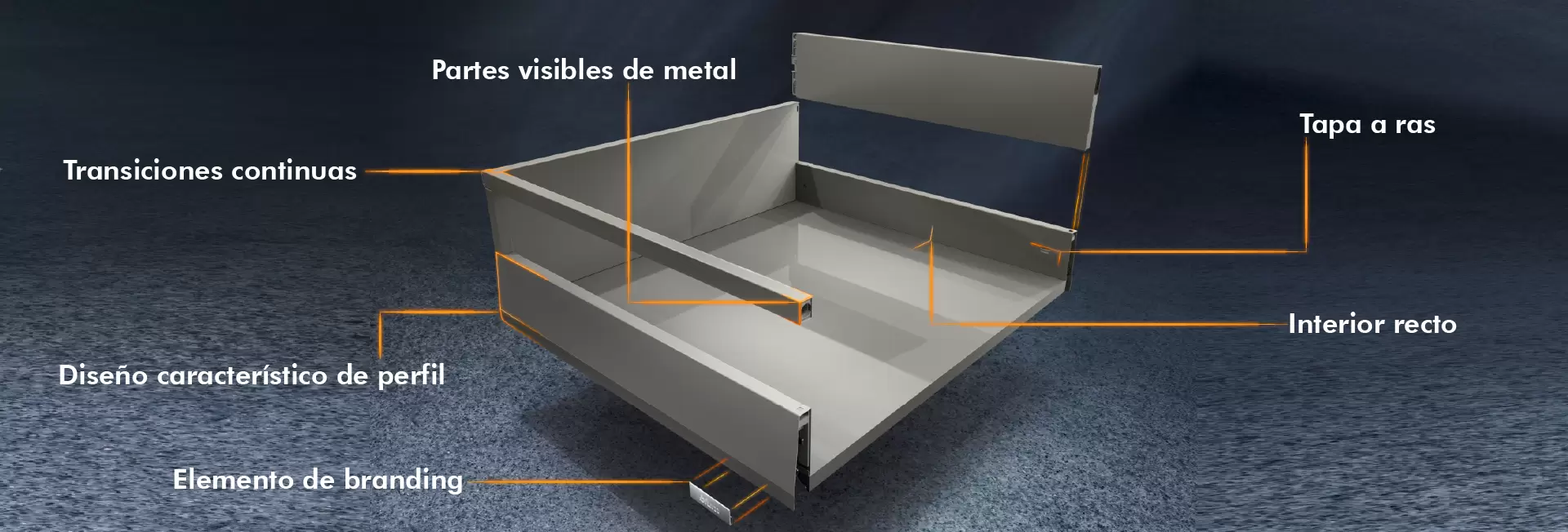 Merivobox es un cajón único, que te ofrece una gran estabilidad y sincronización en su apertura y cierre, y todo, sin necesidad de hacer más complejo el proceso de montaje, obteniendo como resultado un cajón muy seguro y con un movimiento ultraligero. Además, su frente se adapta a todas las variantes de cajones sin afectar el espacio en su interior (el cual es totalmente recto) aprovechando al máximo el espacio de almacenaje hasta el borde (con la posibilidad de aplicar los sistemas de organización interna, AMBIA-LINE).