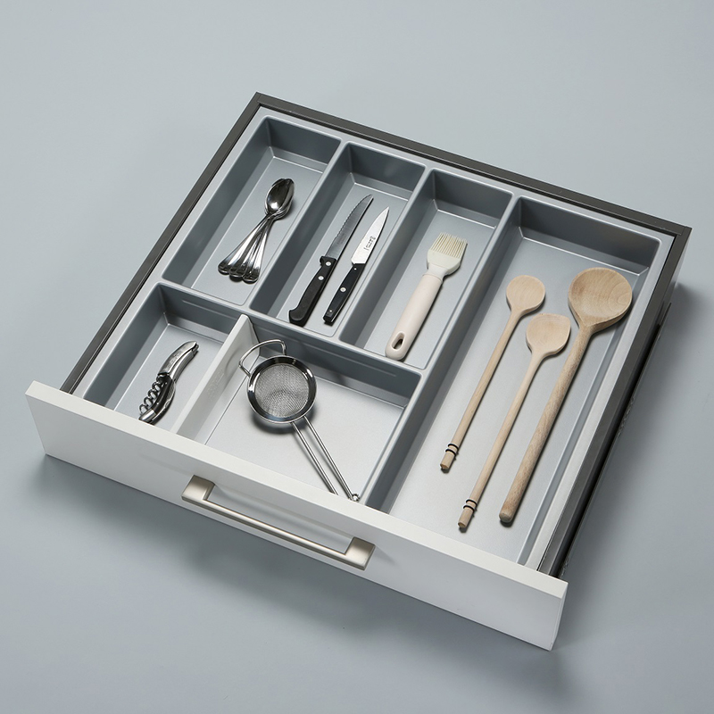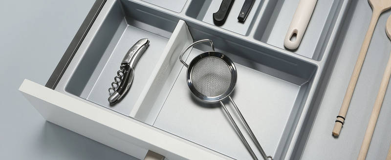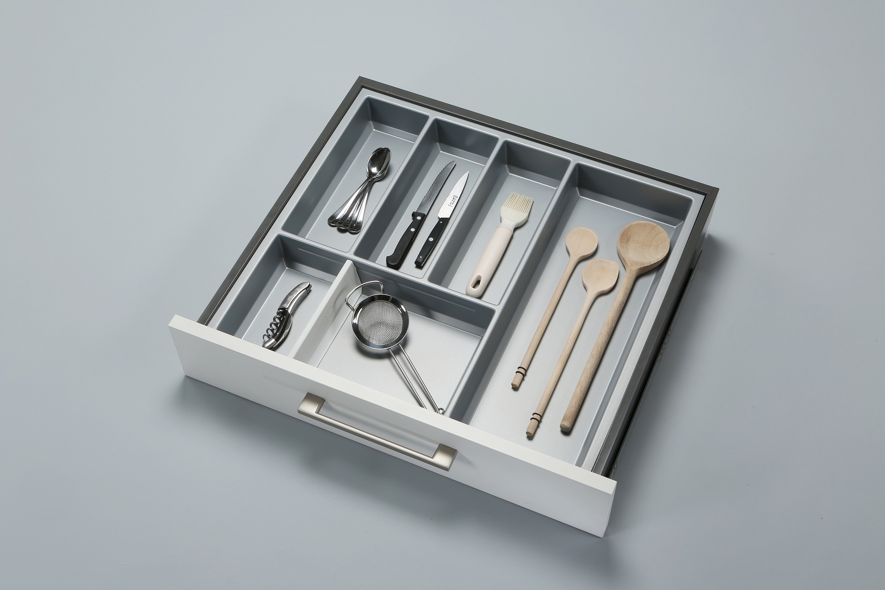 El organizador de cubiertos SKY es una línea de organizadores de poliestireno, higiénica y de fácil limpieza. Además, su nuevo diseño recto se adapta armoniosamente a nuestros sistemas de cajón Blum.