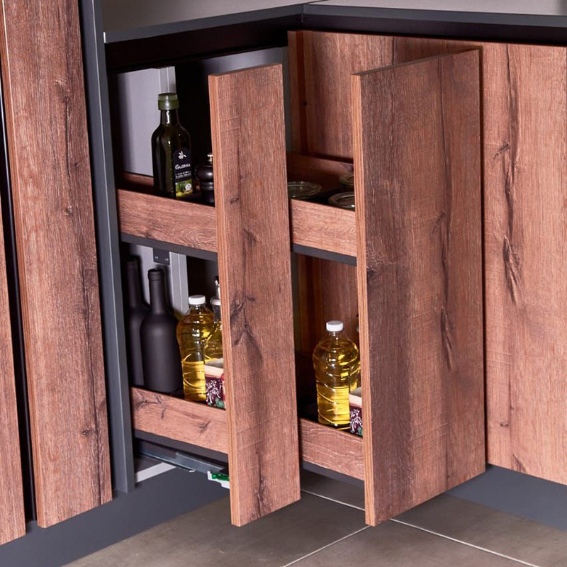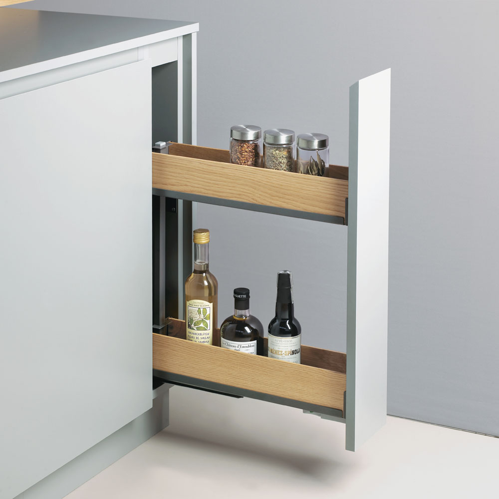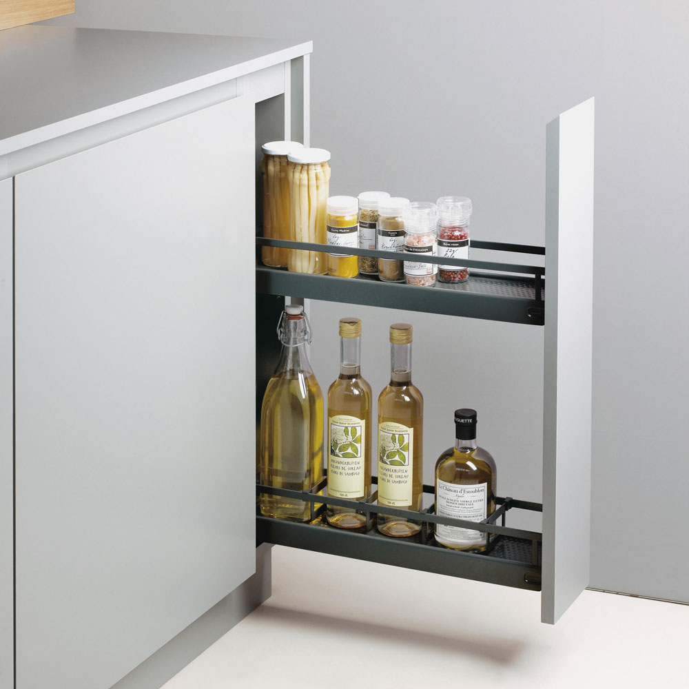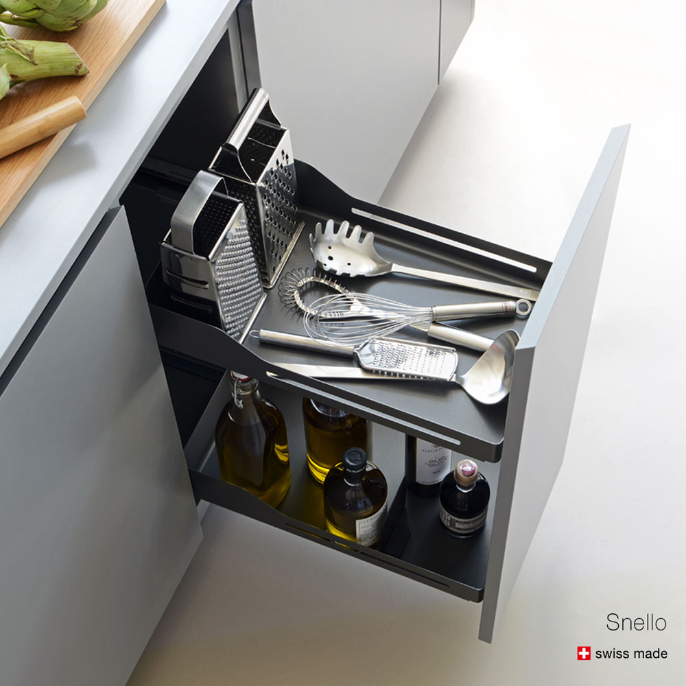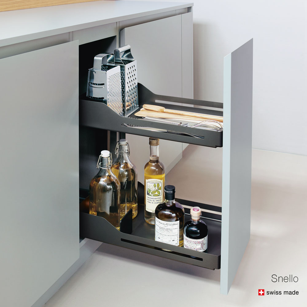 El condimentero para muebles Snello es un herraje de extracción compacto para la cocina que permite la utilización óptima del espacio en módulos bajos.