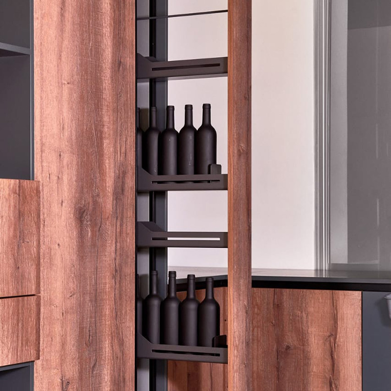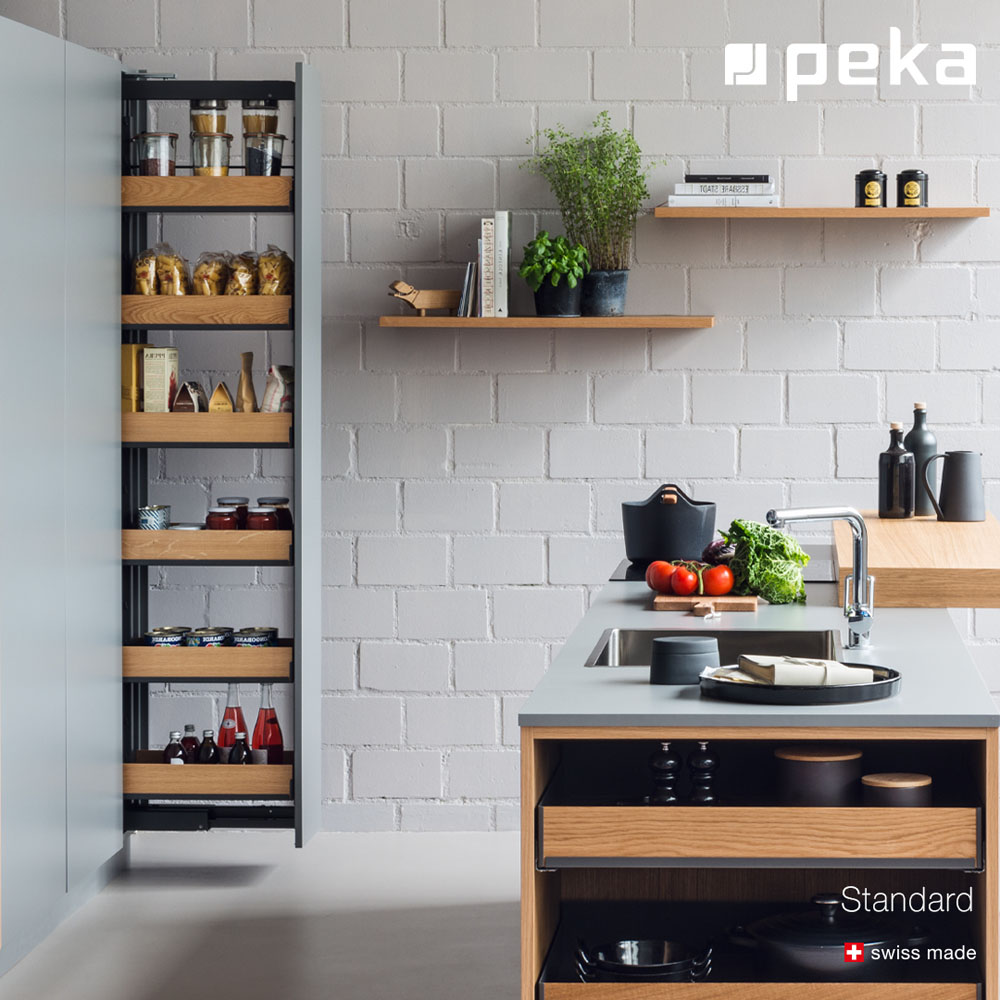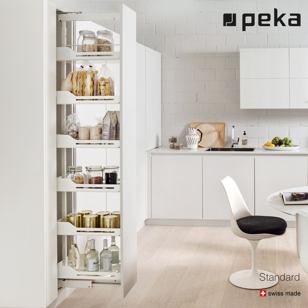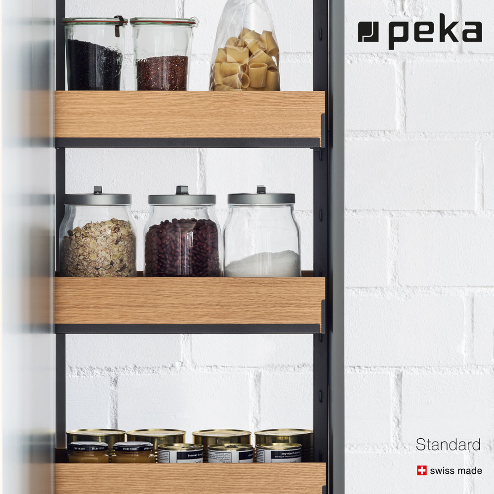 La despensa Standard de Peka System es un sistema de extracción total y movimiento suave, que permite un óptimo aprovechamiento del espacio gracias a estantes regulables en altura. Cuenta con bandejas troqueladas con esquinas redondeadas fáciles de limpiar.
