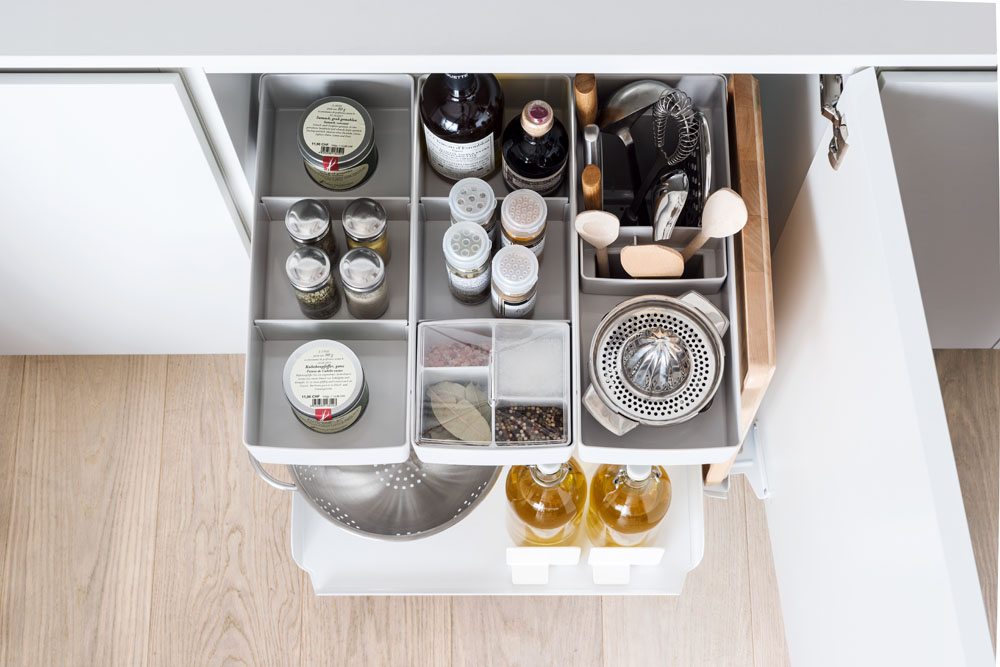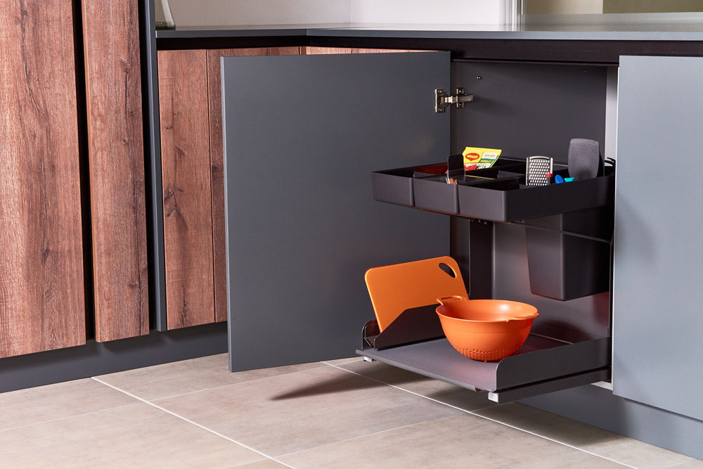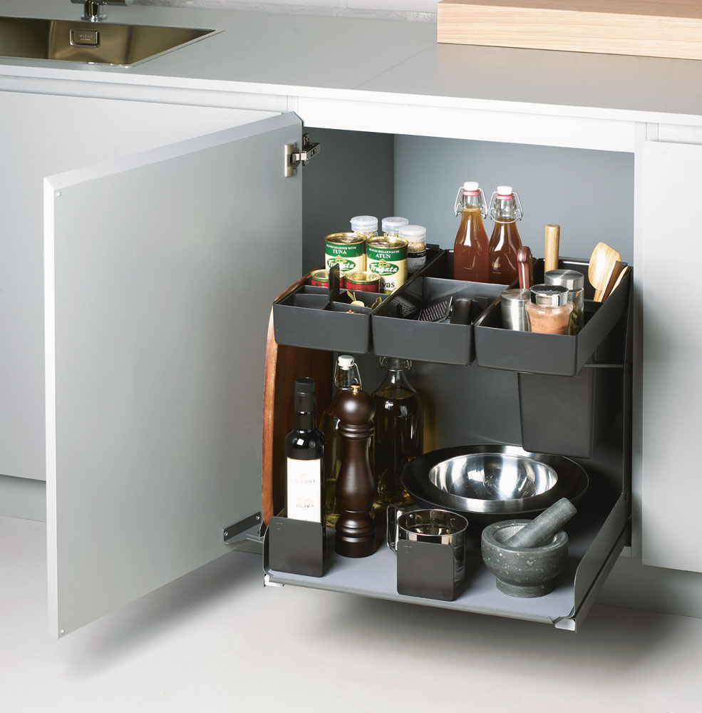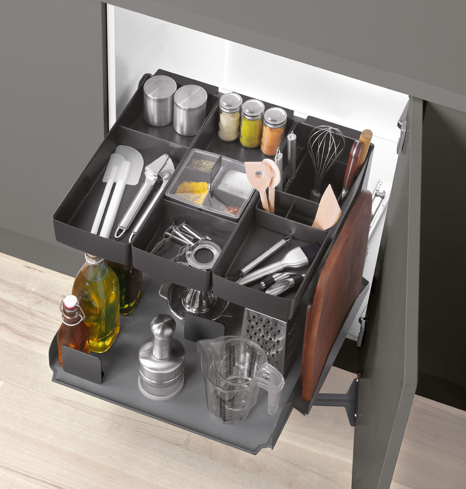 Su sistema de extracción automática se activa al abrir la puerta del armario, brindando acceso cómodo y visibilidad desde tres lados. Incorpora bandejas diseñadas para cuchillos, cucharones, tablas de picar y dosificadores extraíbles con tapa transparente, perfectos para especias o piezas pequeñas.
