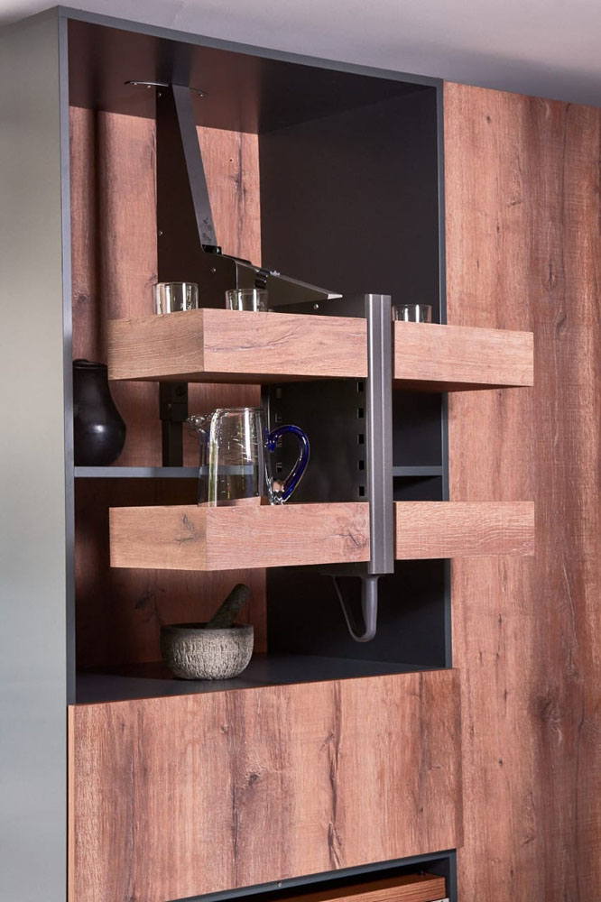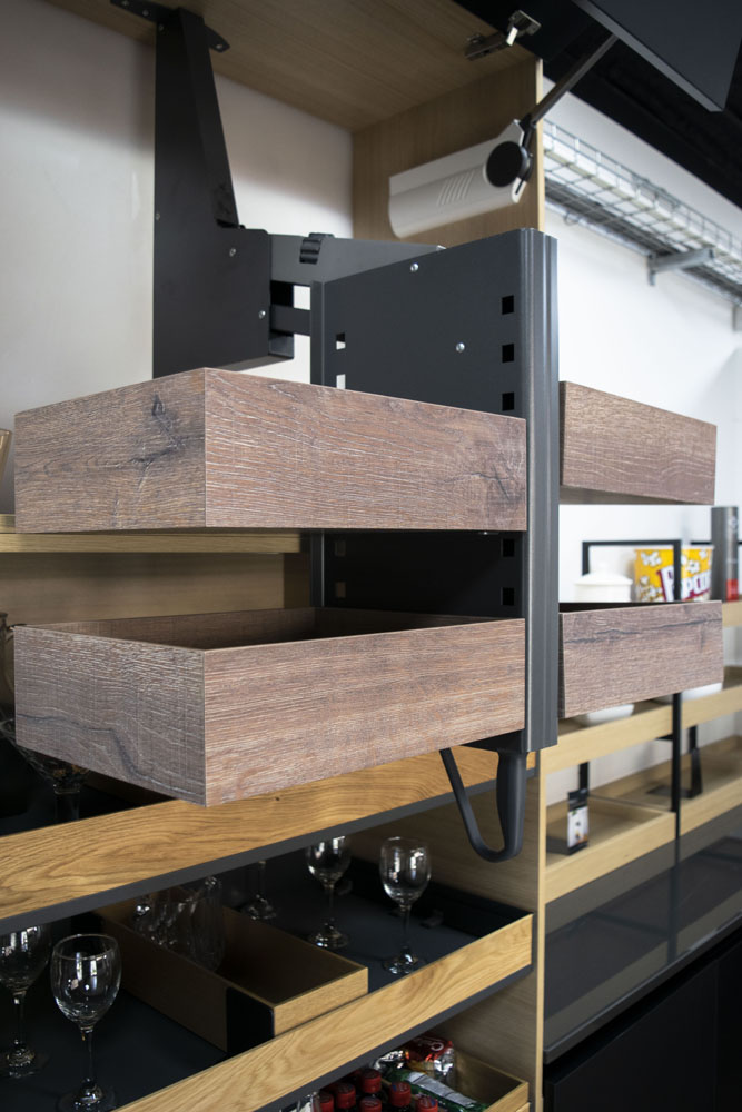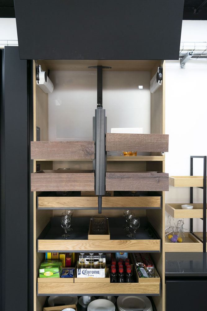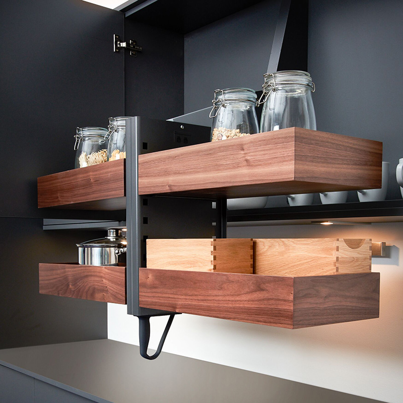 El Sistema Pegasus es una estanteria de cocina pivotante ideal para muebles superiores, que permite acceder fácilmente al contenido completo, ya que desciende con un movimiento suave hasta la altura de los ojos. Tiene apertura y cierre amortiguados, por medio de un freno asistido graduable en fuerza.