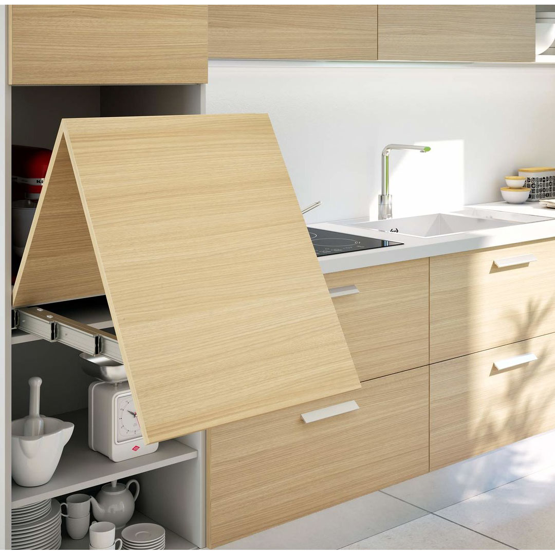 La mesa plegable Homework es una solución ideal para la cocina, el estudio y la oficina. Con un simple movimiento sobre el frente o la puerta, este herraje permite extraer una mesa auxiliar para cualquier tipo de aplicación, ideal para el aprovechamiento de espacios reducidos.