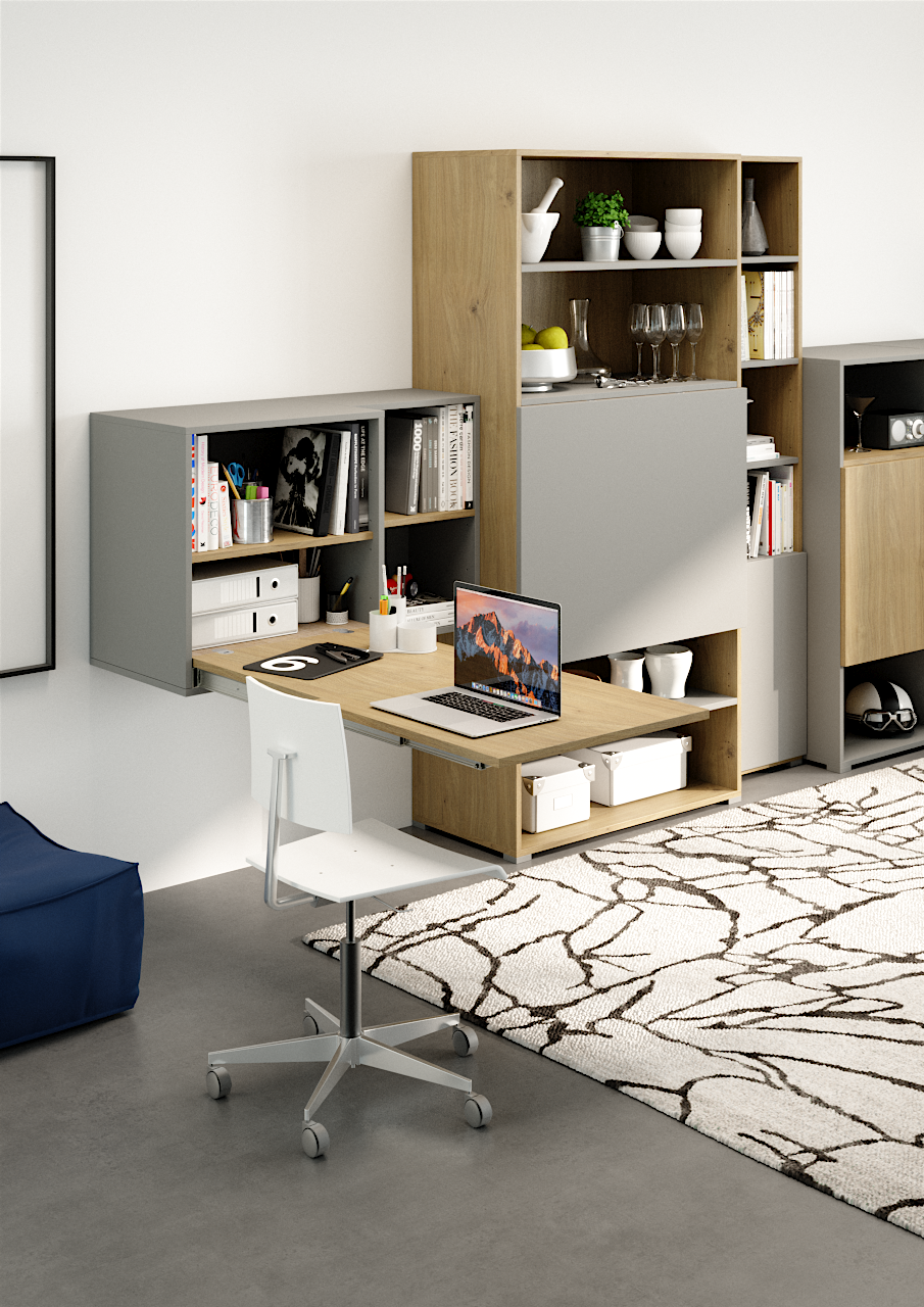 Este sistema tiene dos presentaciones para que el mueble se vea y funcione perfectamente. Al doblarse, la mesa se convierte en una puerta que puede cubrir el interior del mueble, donde se puede poner un mini bar, guardar electrodomésticos, libros y otros artículos. El diseño del mueble y la mesa son armónicos, ya que, cuando se guarda y pliega el sistema, se cubre o tapa el espacio a ras de este, haciendo la ilusión de que no hubo o hay algo guardado.