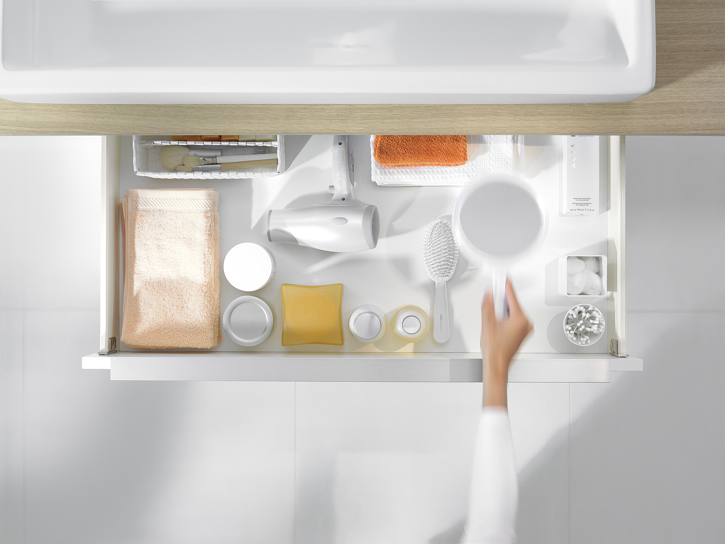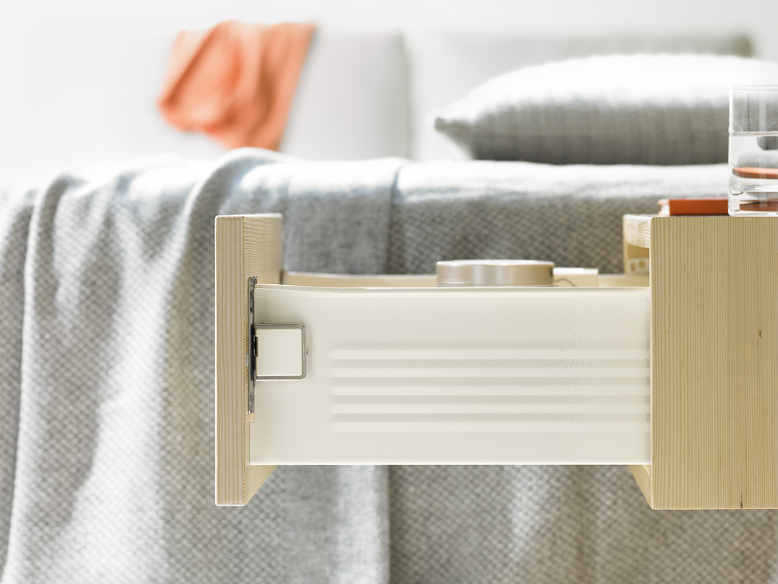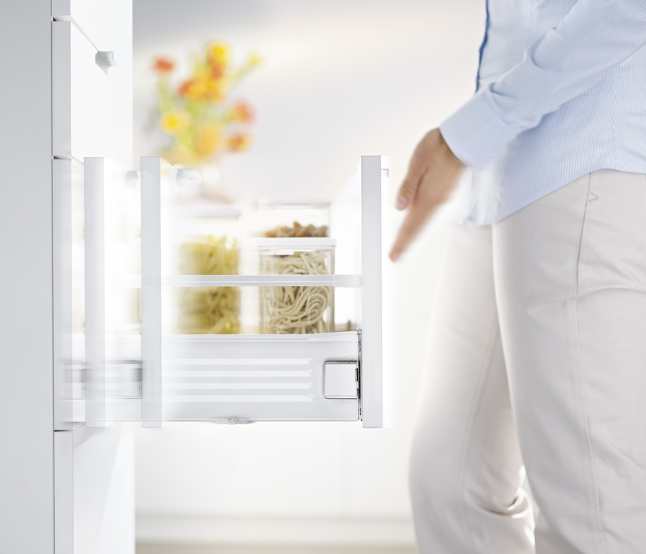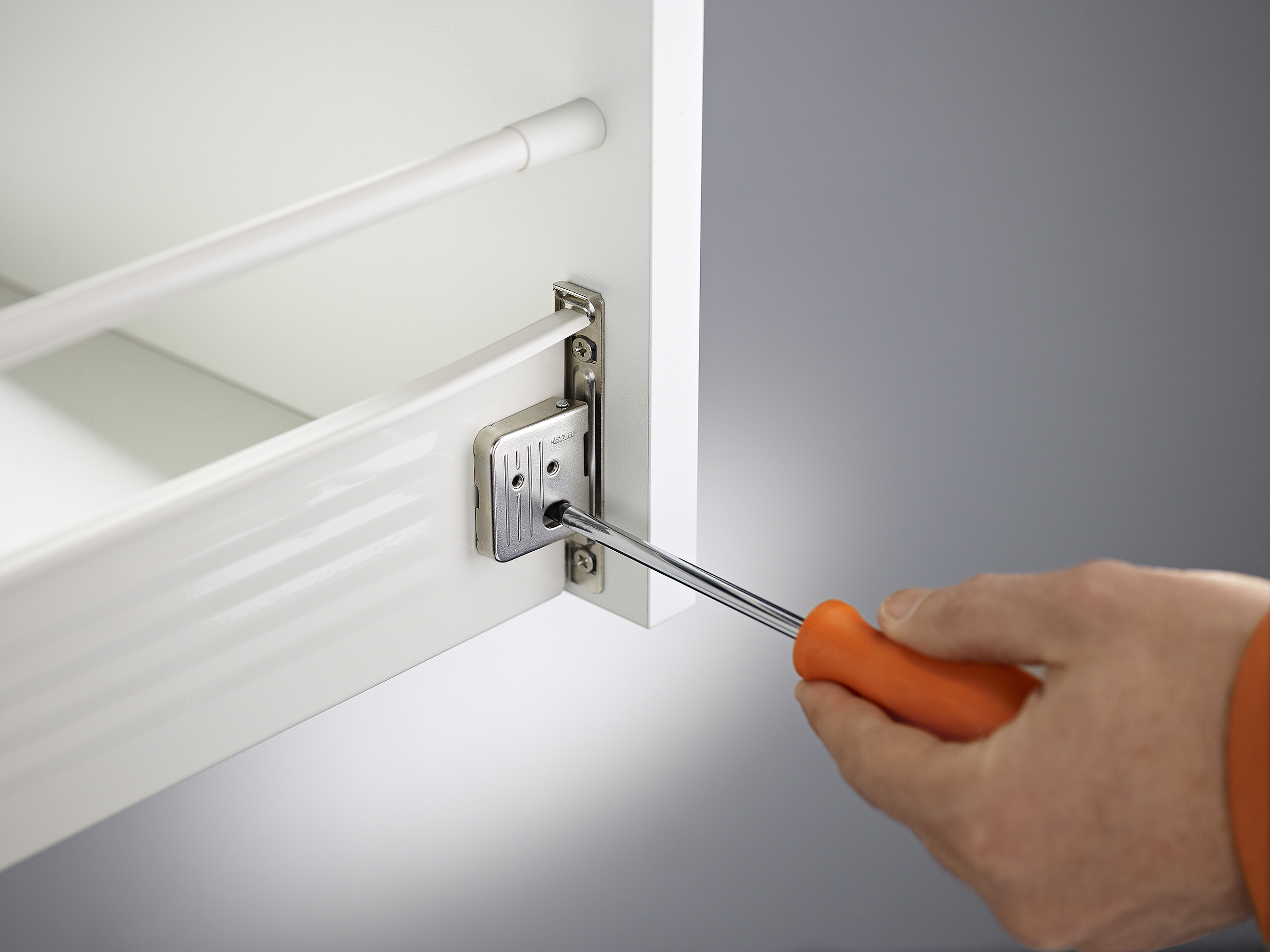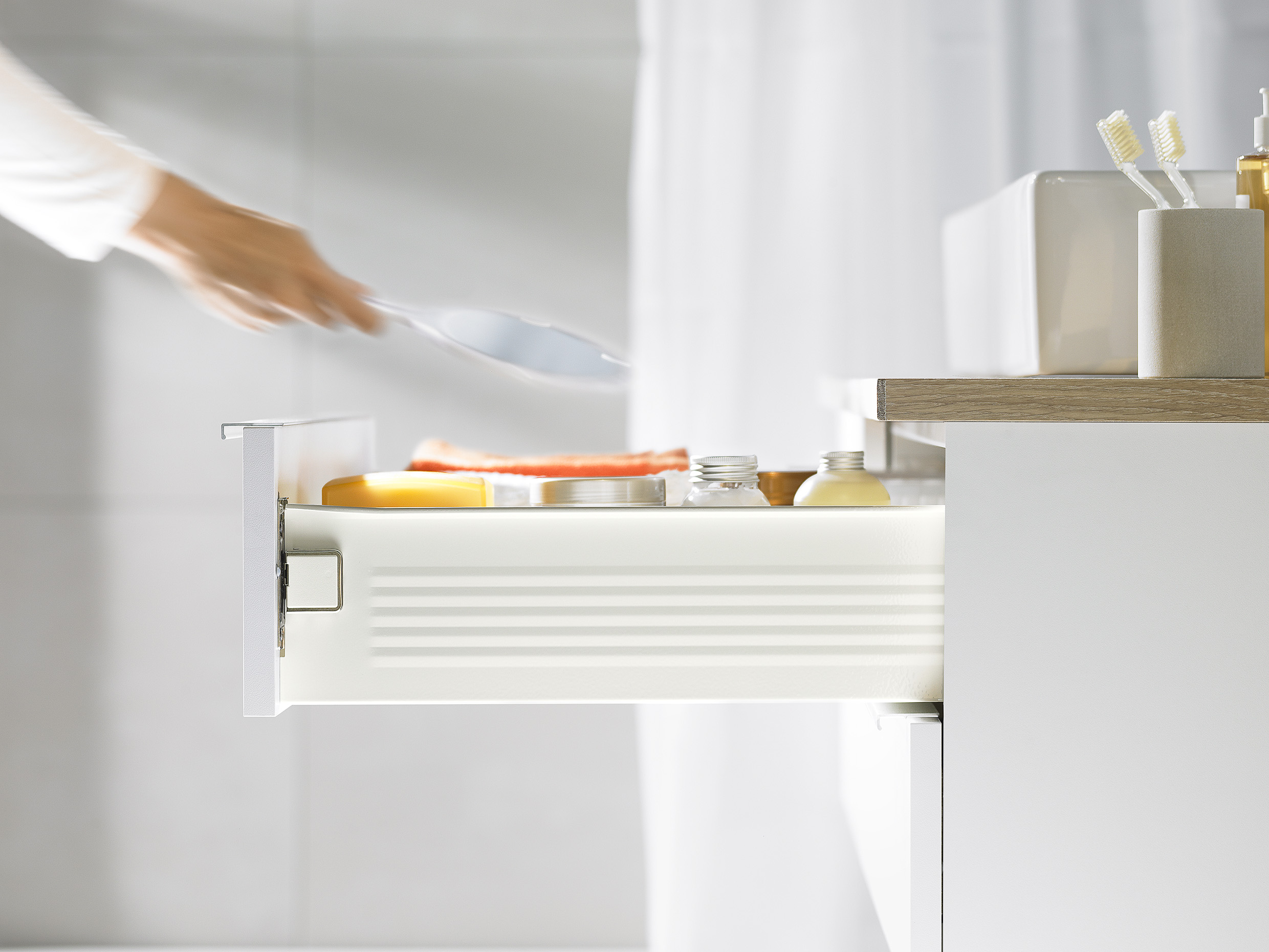 Metabox permite un ajuste rápido en tres dimensiones y su sistema de montaje y desmontaje facilita tanto la instalación como la limpieza. Incluye además la tecnología Blumotion, que asegura un cierre suave y silencioso, incluso con carga.