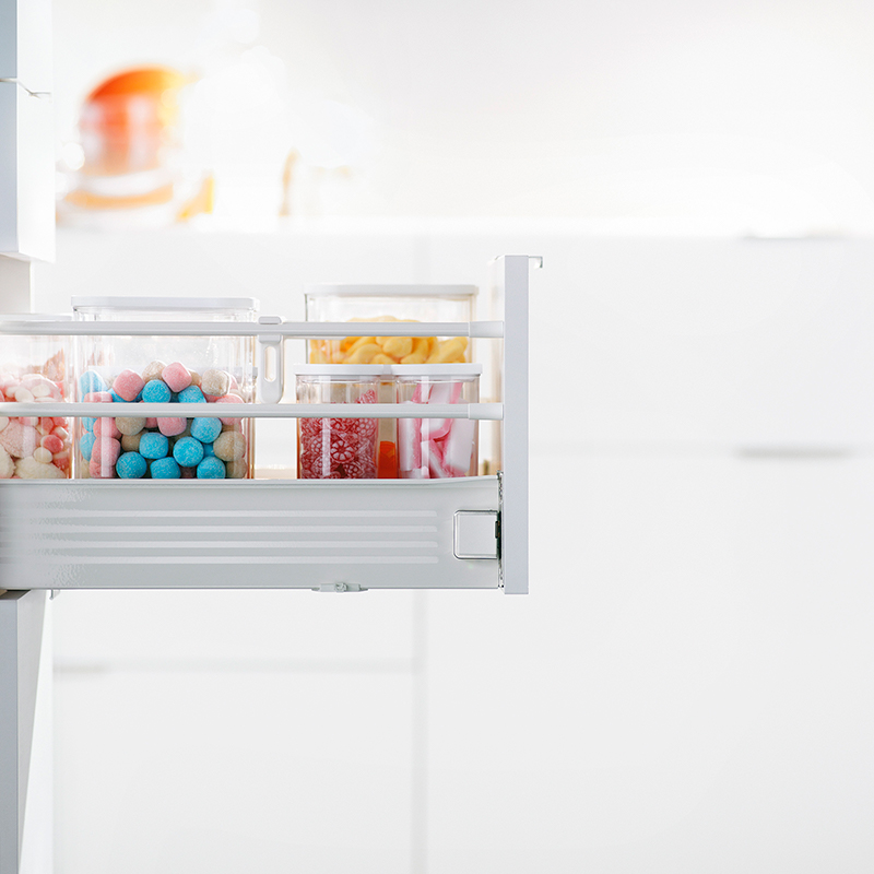 Este sistema ofrece una extensión parcial de las correderas y soporta una capacidad de carga de hasta 25 kg, lo que lo convierte en una solución funcional para almacenaje de uso diario.