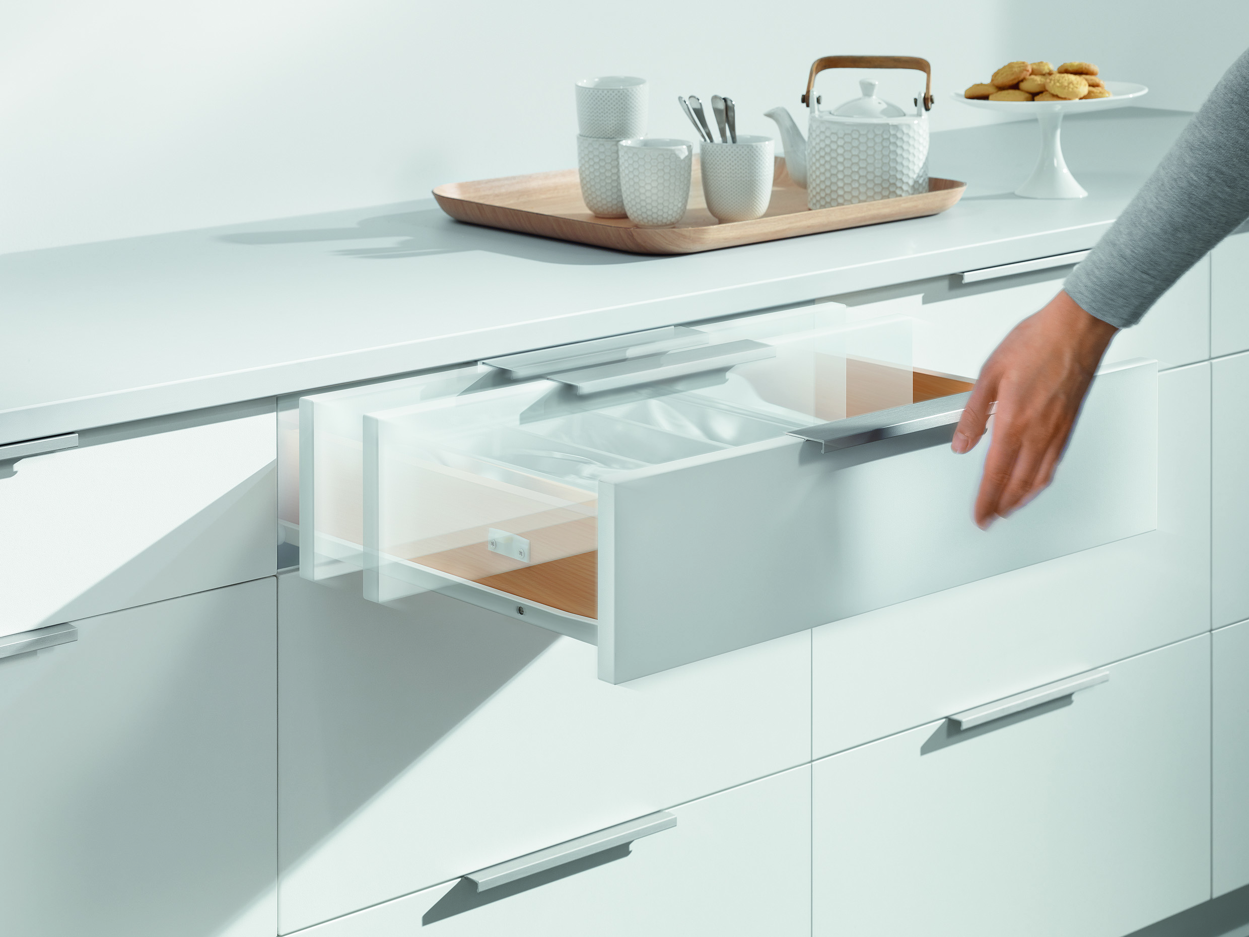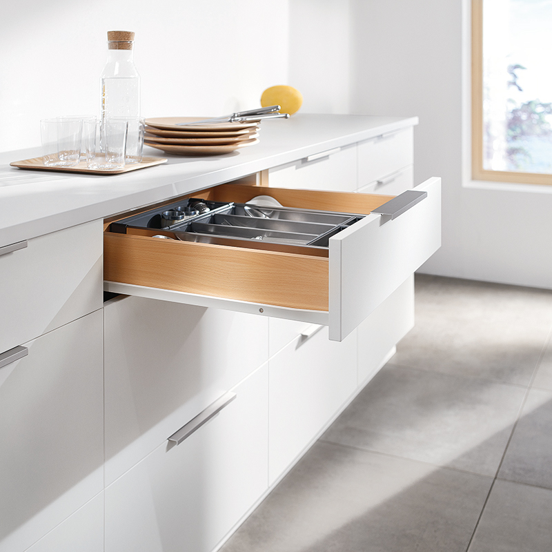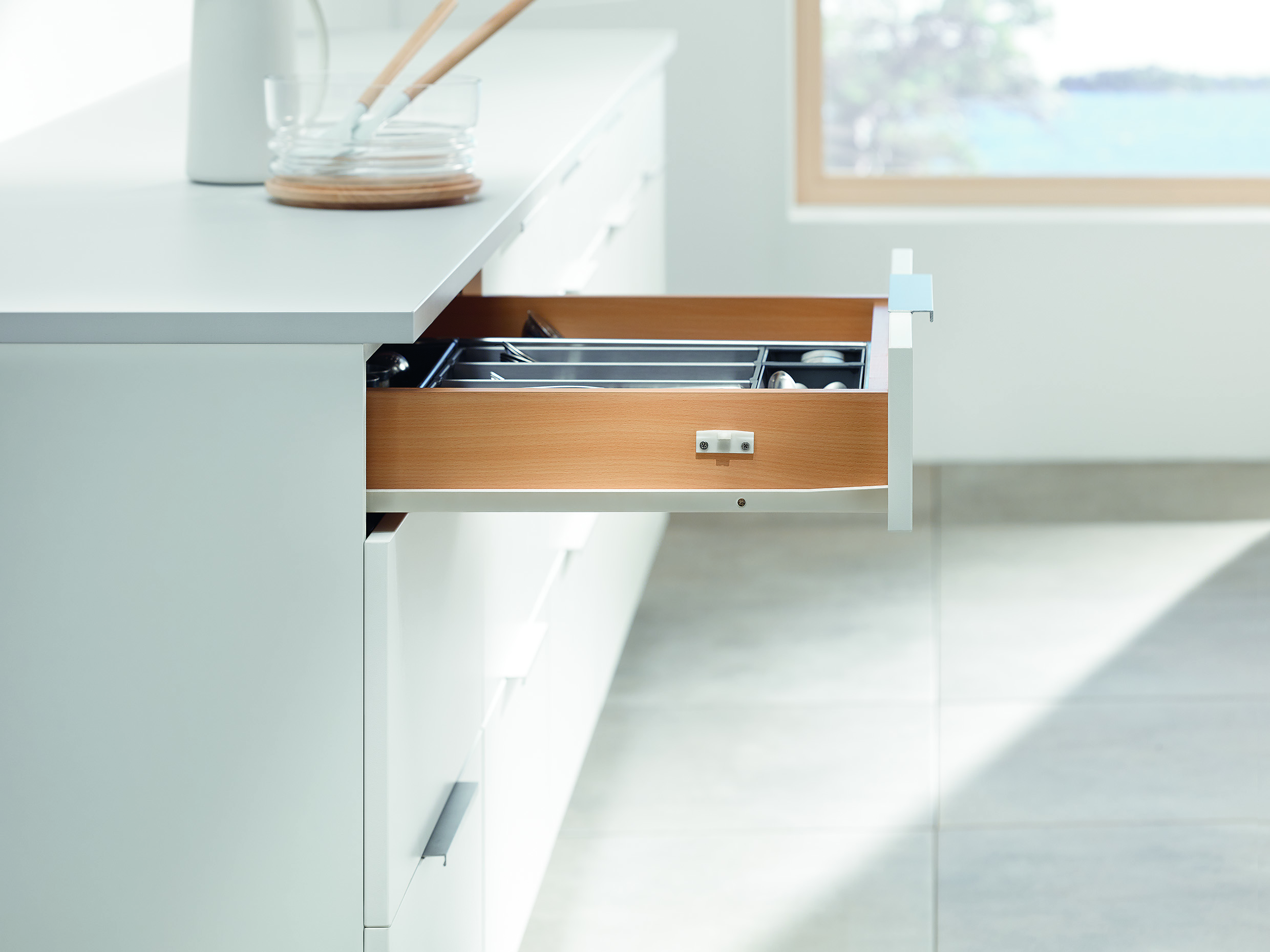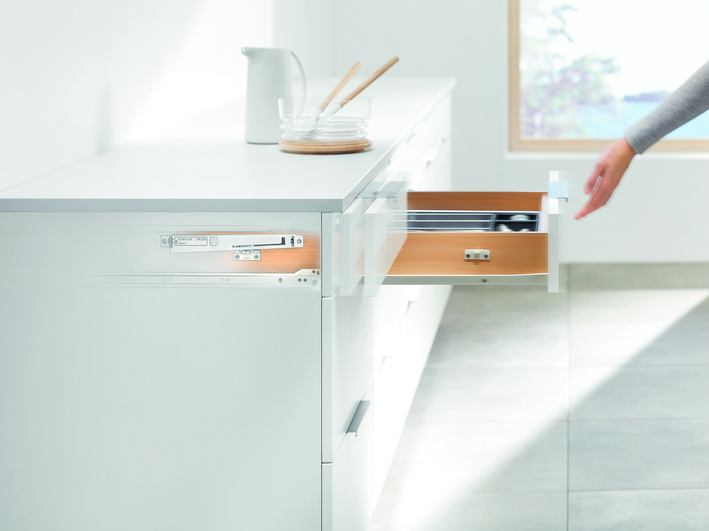 Está disponible en profundidades de 300 mm, 450 mm y 500 mm, y en acabados crema y marrón. Esta corredera también puede incluir tecnología Blumotion, la cual proporciona un cierre suave y silencioso.