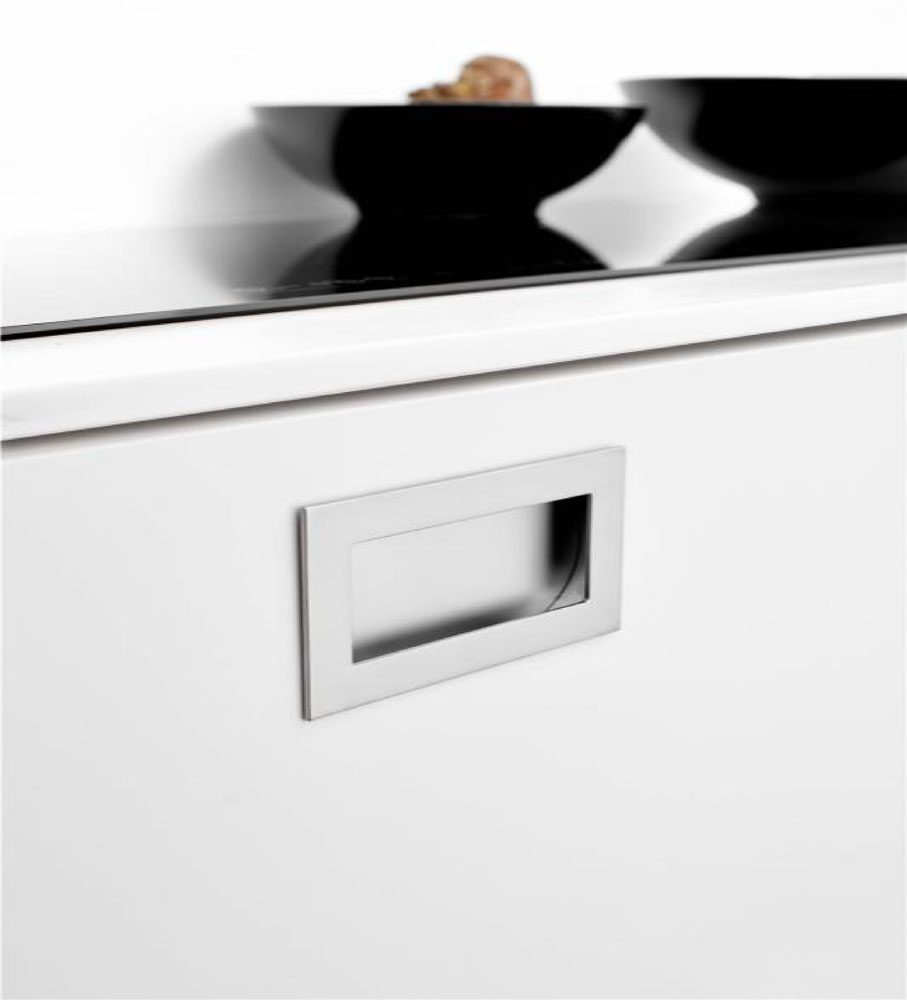 Manija para puertas de gabinetes y frentes de cajones, para insertar en ranura realizada sobre la superficie en madera.