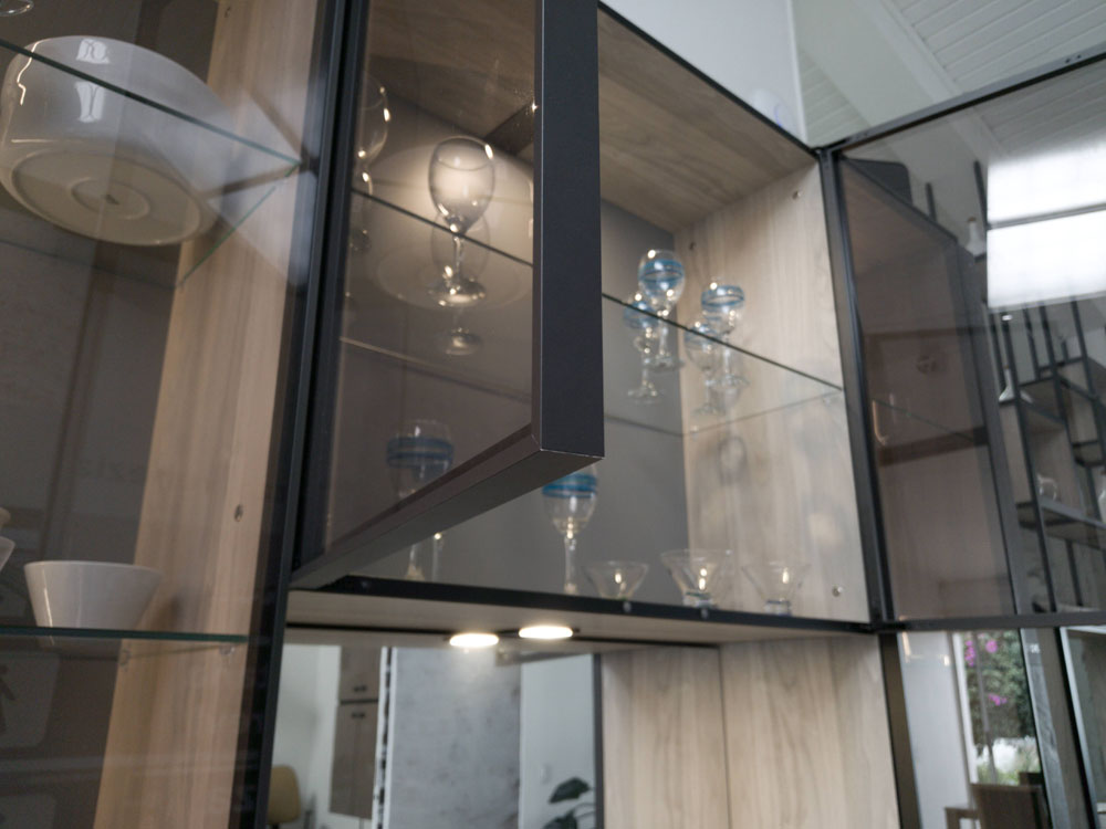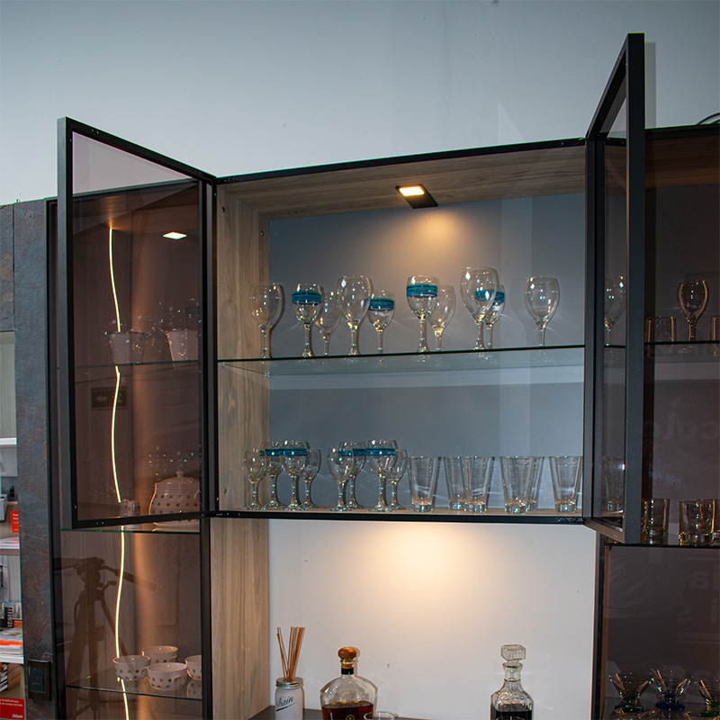 Las perfilerías de los marcos de aluminio para puertas satisfacen todas las necesidades de los muebles, tanto en las secciones superiores como inferiores y en despensas. Estos perfiles brindan una alternativa de diseño que se complementa perfectamente con bisagras invisibles para puertas de vidrio de 4 mm de espesor.