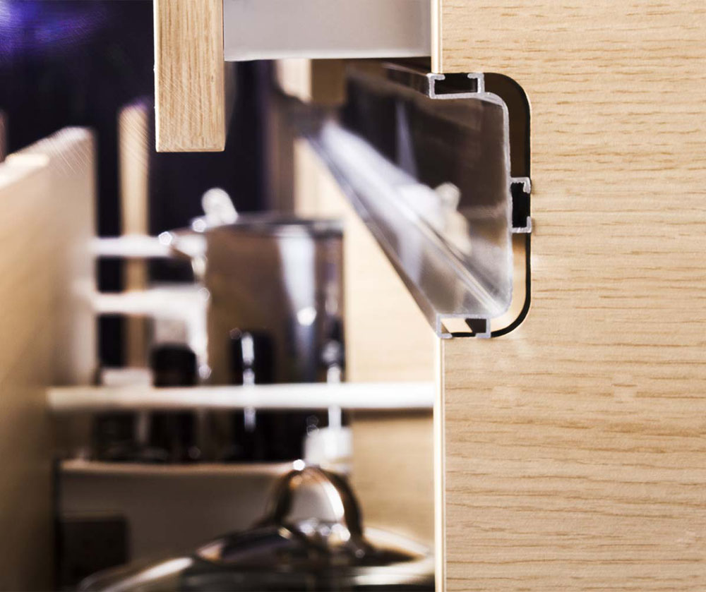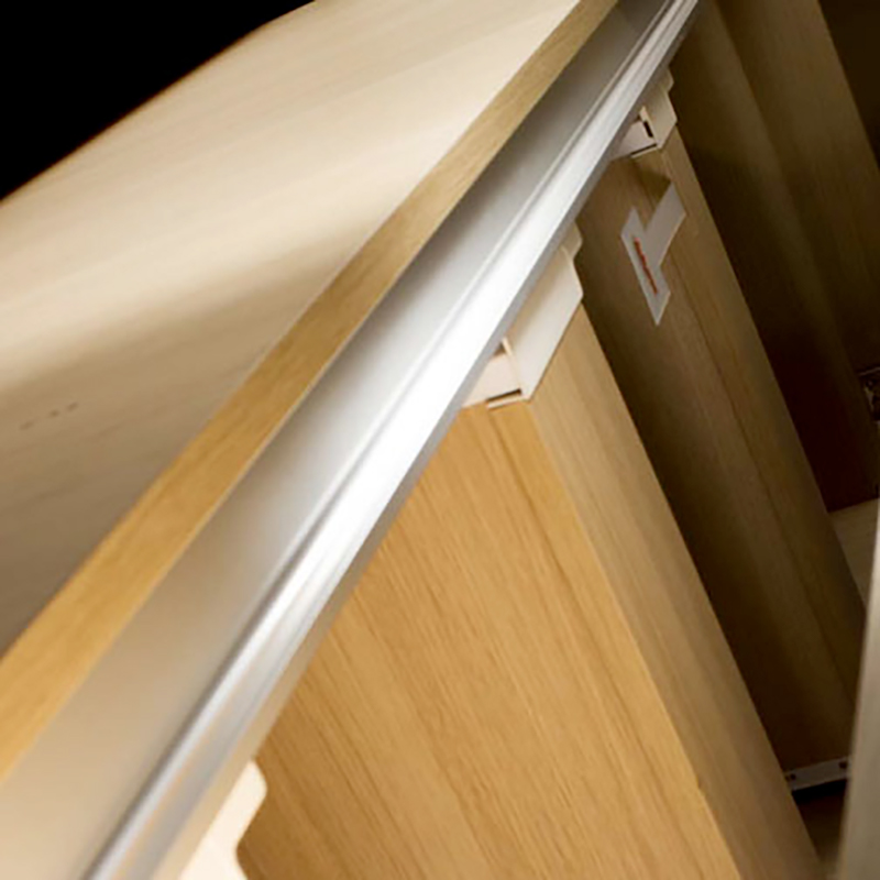 - Funcionan como manijas sin afectar el frente del mueble, aptos para puertas que no cuentan con un sistema de apoyo de apertura. Disponibles en largos de 4200 mm.