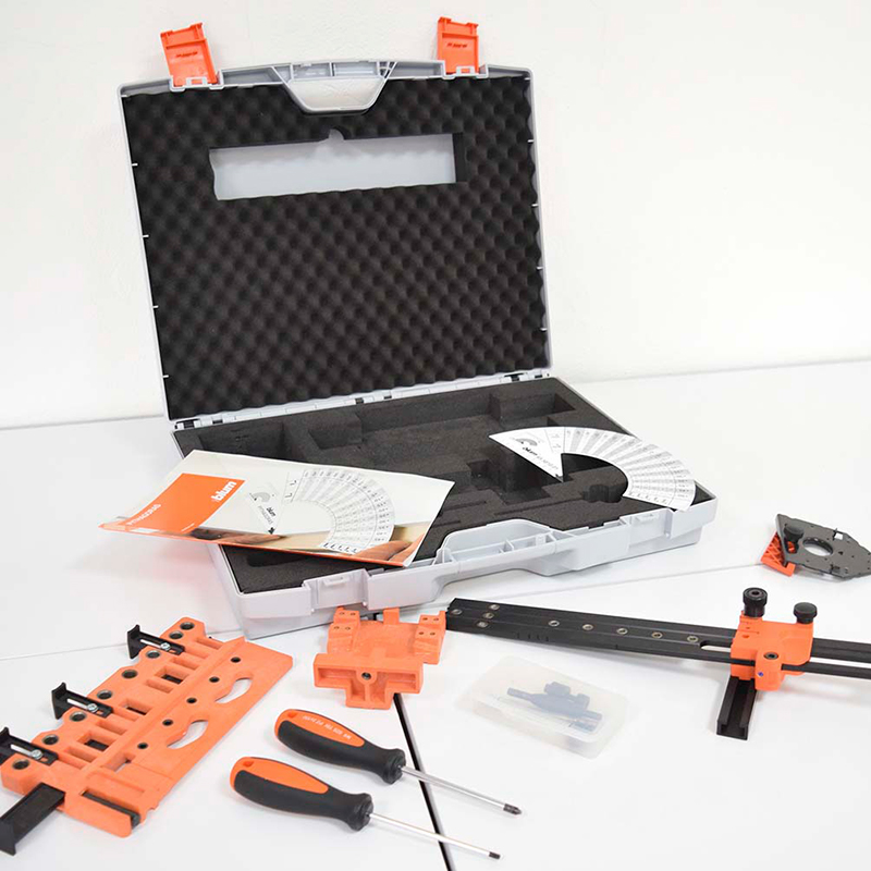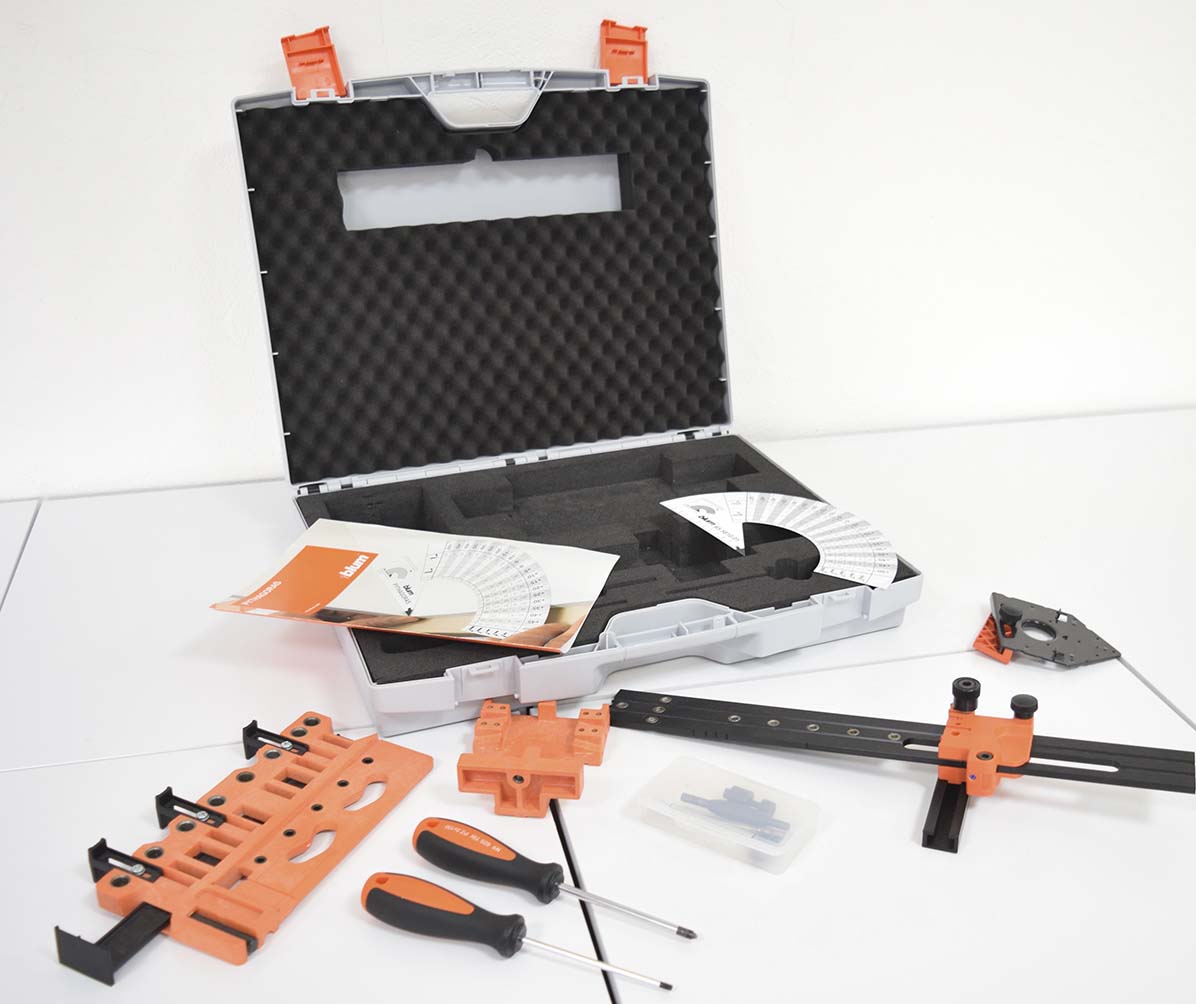 La maleta de presentación de plantillas básicas de Blum es un kit completo con algunas de las más imprescindibles ayudas de montaje, que permiten un montaje preciso y sencillo de herrajes. Con estas herramientas y calibres, la instalación resulta fácil, eficiente y cómoda. La maleta incluye los siguientes elementos: