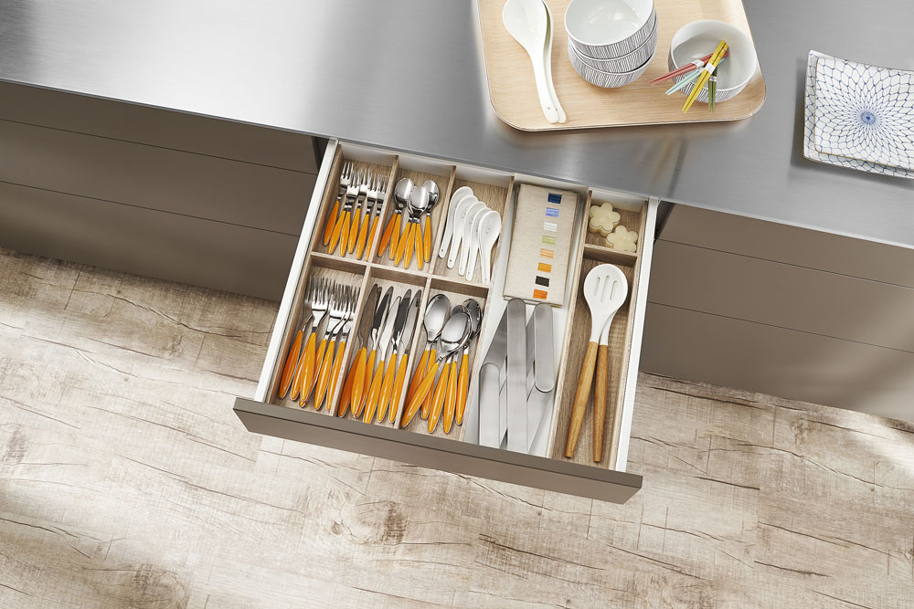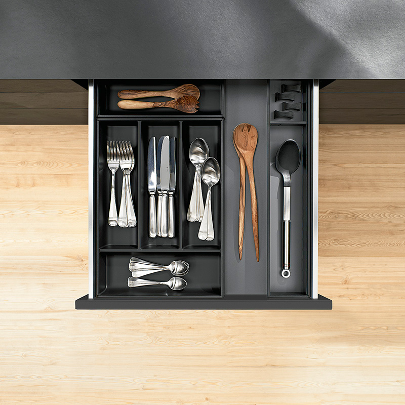 Con un diseño minimalista y funcional, esta bandeja cubertero es el complemento perfecto para el elegante sistema de cajones LEGRABOX. Sus divisiones internas optimizan la organización, adaptándose de forma precisa a las delgadas y rectas paredes laterales de LEGRABOX. Ideal para mantener los cubiertos y utensilios en orden, ofrece una solución estética y eficiente para cocinas modernas y espacios que buscan un acabado sofisticado.