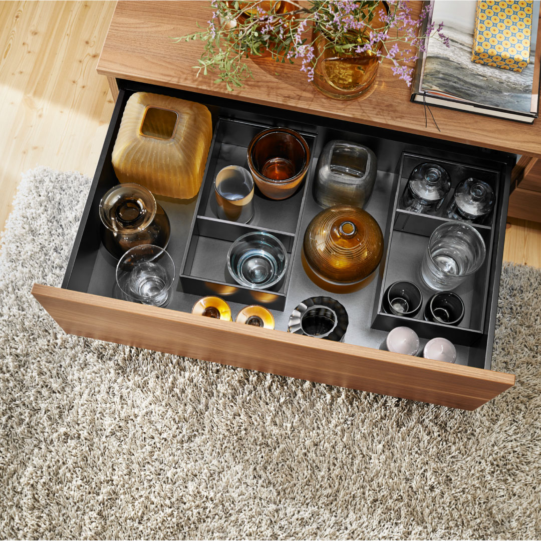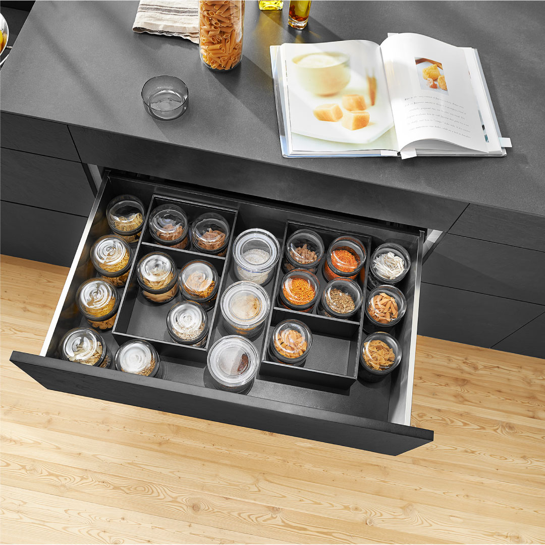 Los marcos caceroleros son organizadores internos que se adaptan a los cajones Legrabox altura C, y se ajustan de manera magnética a sus laterales, para un movimiento seguro y estable.