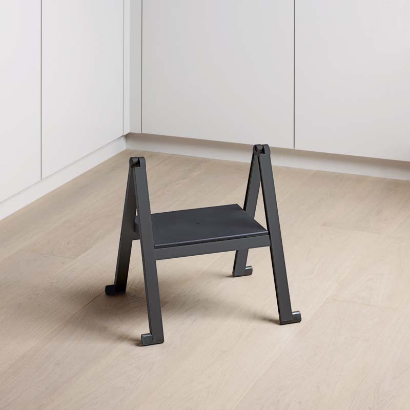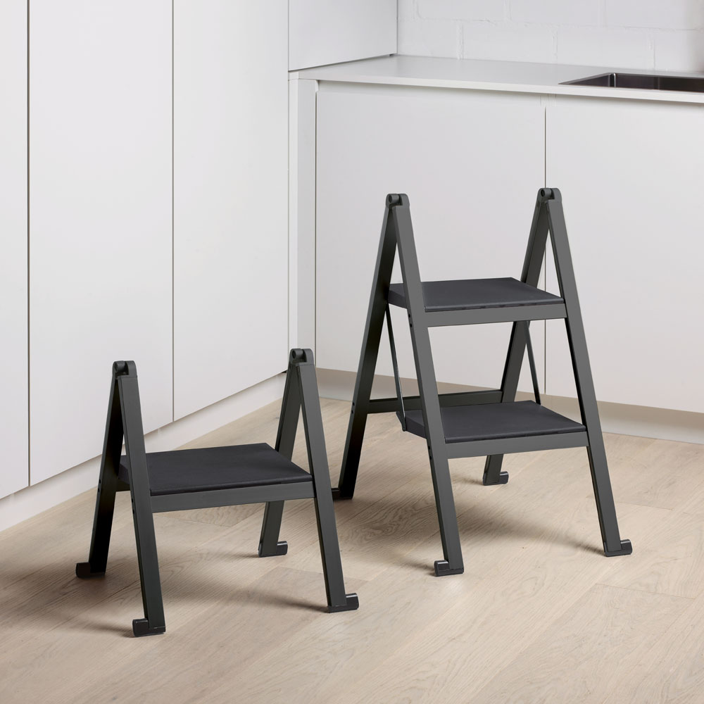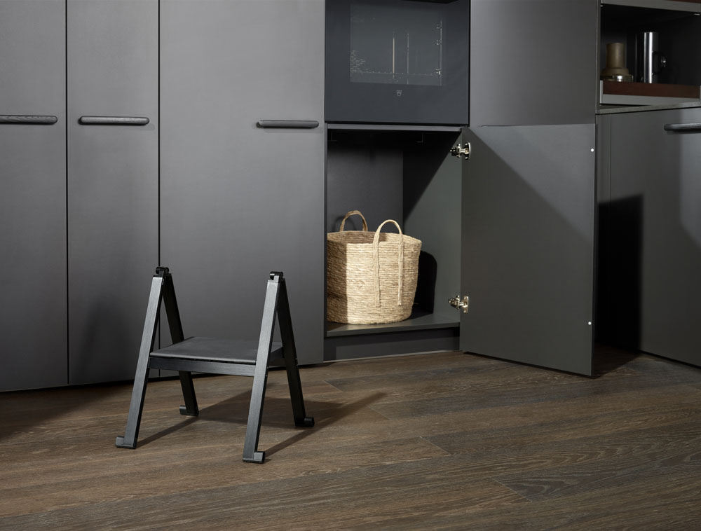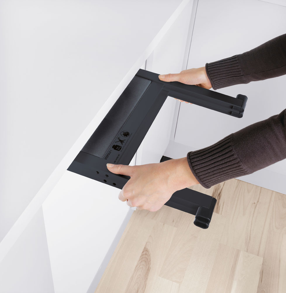 Las prácticas escaleras Stepolo son ideales para acceder a los muebles superiores y pueden ser guardadas en espacios reducidos, dentro de compartimentos o muebles, en donde se puede instalar el soporte de montaje.