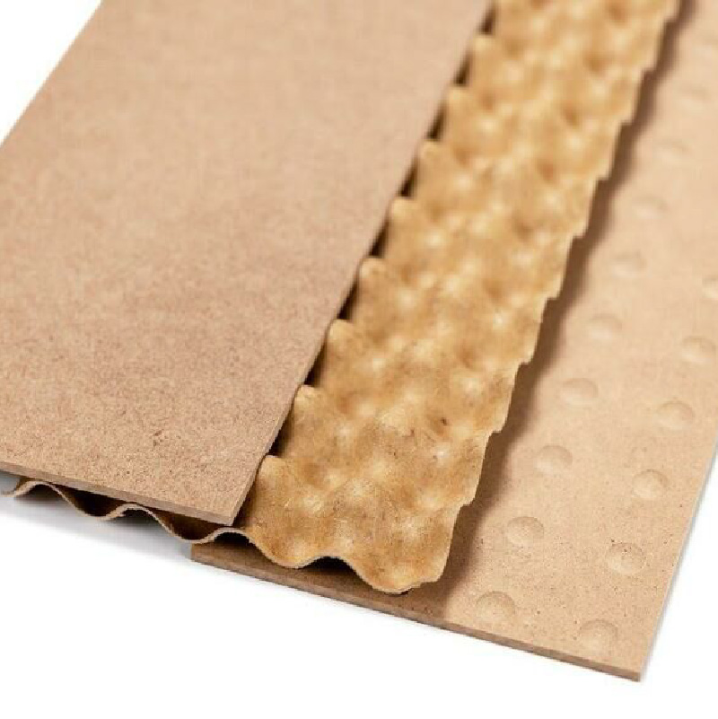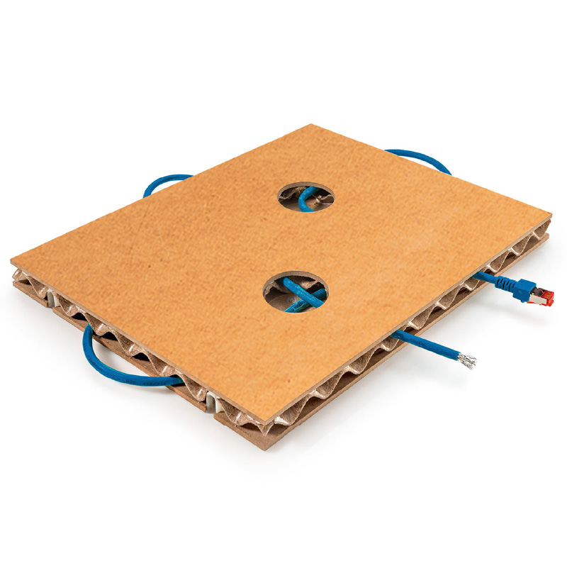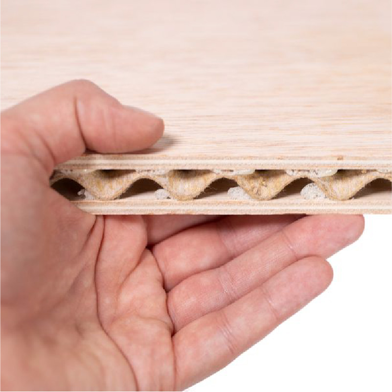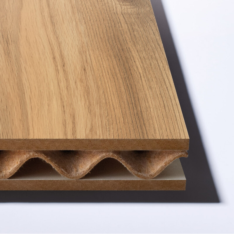 En el interior de ambos paneles se encuentra un centro corrugado, fabricado a partir de vellón de madera o fibra vegetal prensada, que proporciona una estructura robusta y ligera, ofreciendo rigidez estructural y permitiendo la integración de cables o conexiones dentro del panel, sin comprometer su integridad. Además, su diseño facilita el corte del panel y se aconseja el uso de un canto rígido